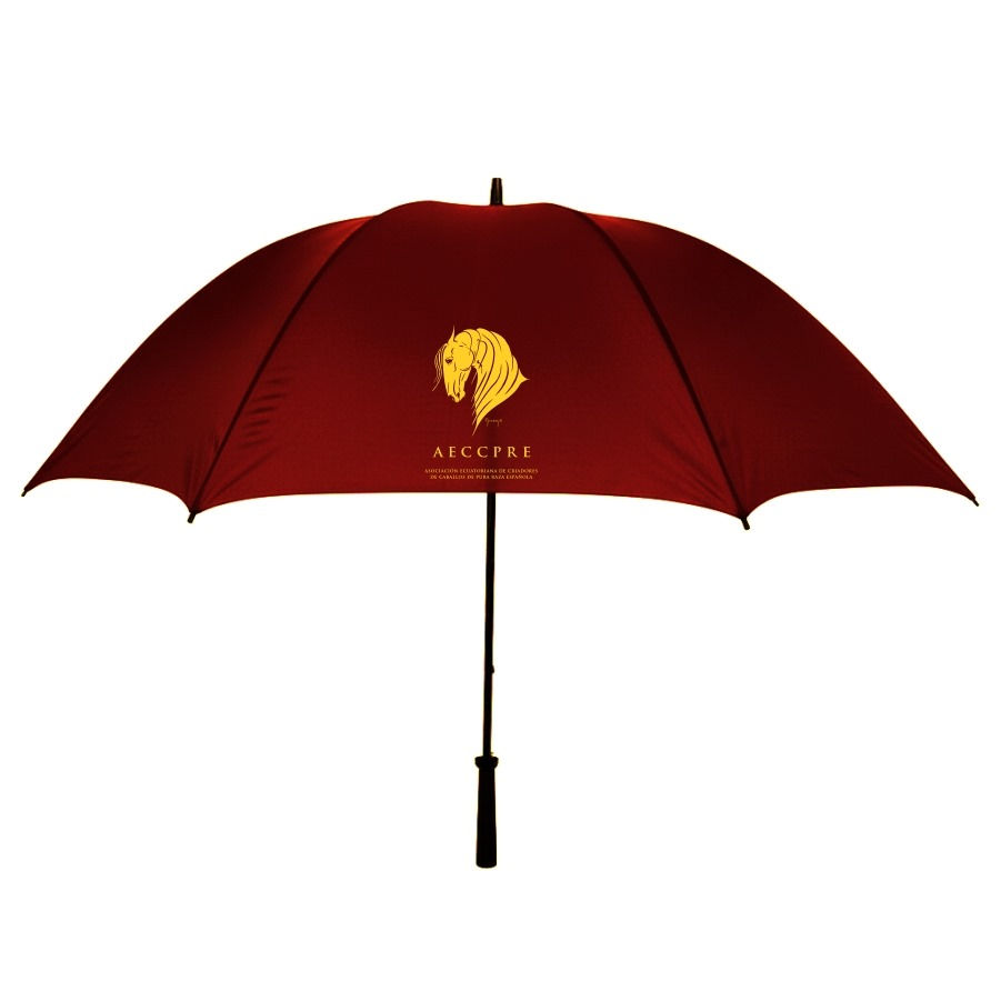 Paraguas elegante en color rojo vino con el distintivo logo AECCPRE en dorado, ideal para criadores y amantes del Caballo de Pura Raza Española. Su estructura resistente y diseño amplio brindan protección y estilo en cualquier clima. Un accesorio práctico y representativo para llevar la identidad del PRE a todas partes.