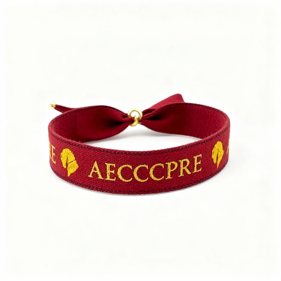 Pulsera textil en color rojo vino con bordados dorados del logo y nombre AECCPRE. Elegante, ajustable y cómoda, diseñada para quienes desean llevar consigo el orgullo y la identidad del Caballo de Pura Raza Española. Un accesorio distintivo y perfecto para eventos, competidores y aficionados del PRE.